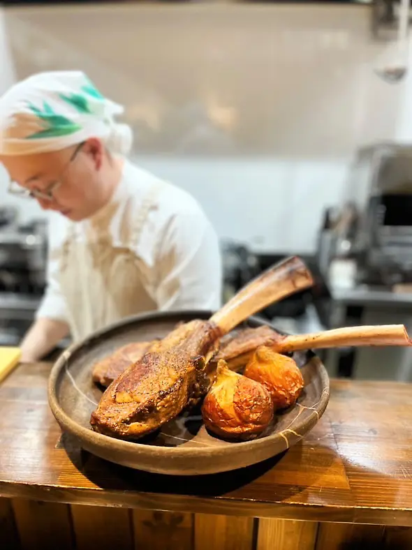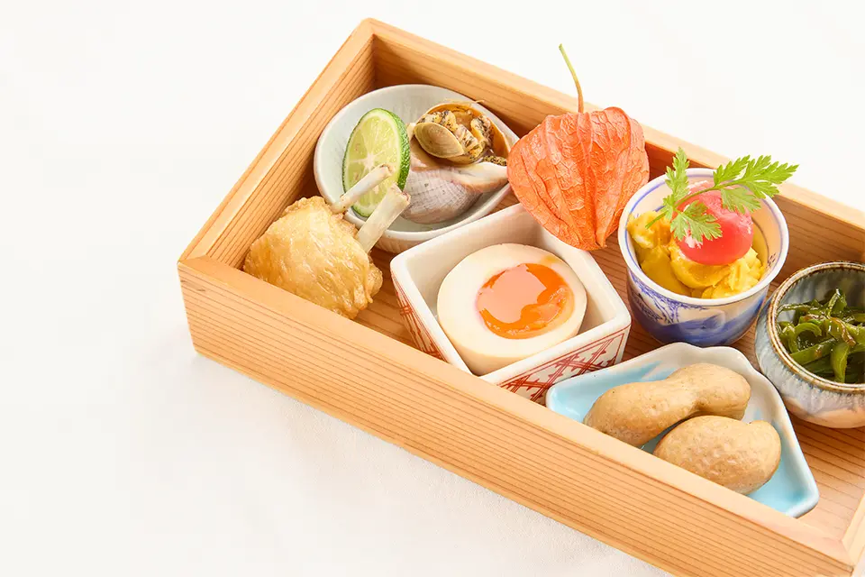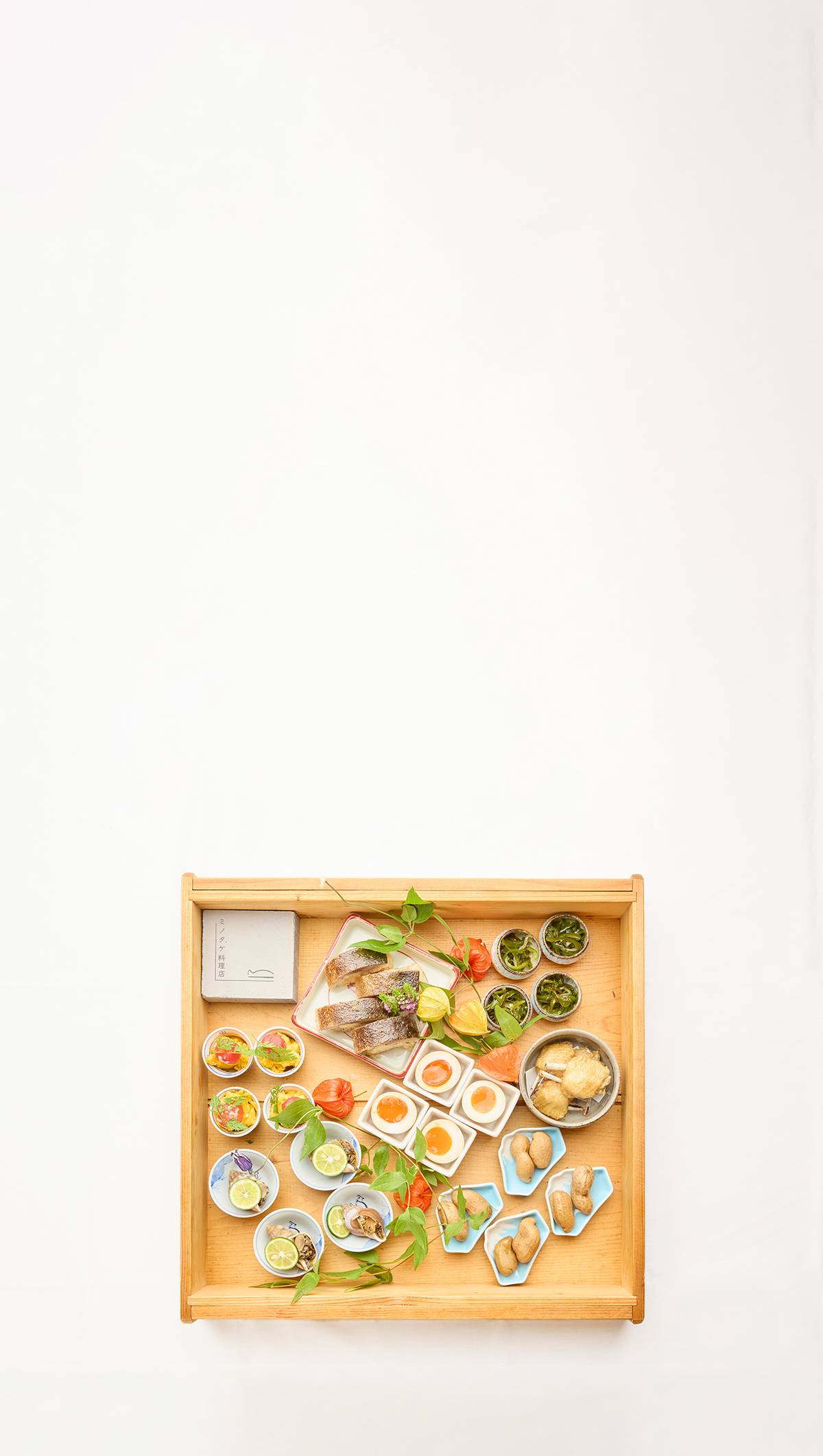 余市の馬渡さんが焼いた器は、手に取るたびに土のぬくもりを感じます。小樽の木村さんの皿は、静かに料理を引き立てる佇まい。倶知安のSomozaさんで出会ったものは、洗練された美しさの中に力強さを秘めています。そして、小樽のyukimichiさんの作品は、どこか優しく、食材をやさしく包み込んでくれます。前菜を盛り付ける木箱は、岩内の太田製麺さんが麺を大切に保管していたものを譲り受け、今は料理の一部としてお客様を迎えています。